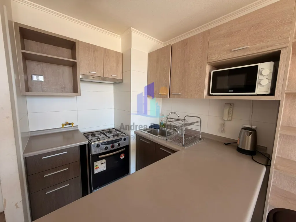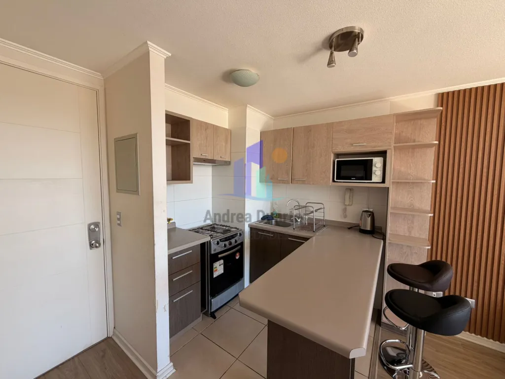 - Cocina americana amoblada, cocina tradicional, microondas, refrigerador